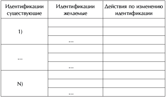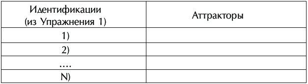 д) Задумайтесь: какие из идентификаций (особенно связанных с конфликтующими аттракторами) вы хотели бы со временем изменить. (Посмотрите на ваши ответы к Упражнению 2.)