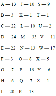 Ученые, занимающиеся вопросами оккультизма, разработали специальные таблицы по вычислению событий и судеб. Вот цифровые значения букв, взятые из древнего еврейского манускрипта и приведенные к латинскому алфавиту.