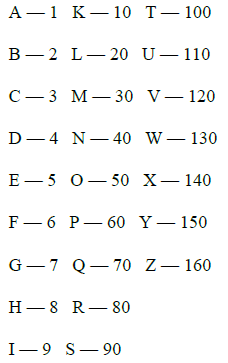 Впервые этот метод был использован семитами-халдеями и иудеями. И таким образом буквы древнееврейского алфавита были заменены числами. Теперь любое имя, переложенное в цифры, можно было «счесть», как сказано в Откровении Иоанна.