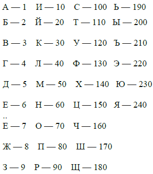 Французские буквы, подобно еврейскому числу-изображению, по которому первыми десятью буквами обозначаются единицы, а прочими десятки, имеют следующие значения: