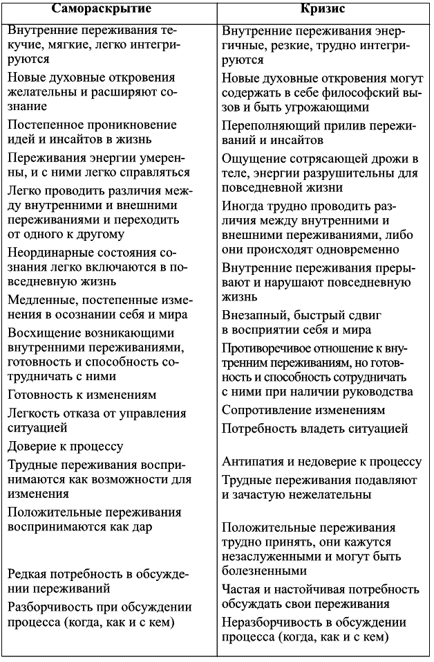 Важно понимать, что даже самые драматичные и трудные эпизоды духовного кризиса представляют собой естественные стадии духовного раскрытия и, в благоприятных обстоятельствах, могут быть полезными. Активация психики, характерная для таких кризисов, включает в себя радикальное прояснение различных старых травматических воспоминаний и впечатлений. Этот процесс является потенциально целительным и преображающим по самой своей природе. Однако на поверхность выходит так много психологического материала с различных уровней бессознательного, что это начинает мешать повседневному функционированию человека. Таким образом, вовсе не природа и содержание этих переживаний, а их контекст заставляет их казаться патологическими. Подобные состояния были бы не только приемлемыми, но и желательными в эмпирической психотерапии, проводимой под опытным руководством. Однако их большая длительность – в отличие от терапевтических сеансов эти переживания могут продолжаться дни и даже недели – требует специальных мер.