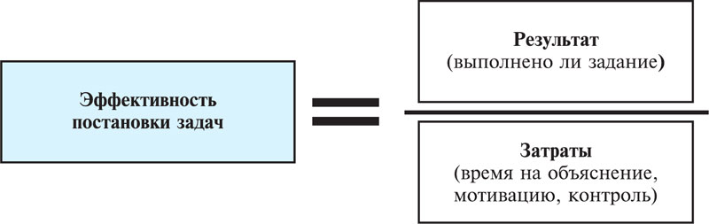 В соответствии с базовым принципом эффективности мы можем определить эффективность постановки задач как соотношение результата (выполнено ли задание) и затрат времени и сил на объяснение задания, мотивацию, контроль.