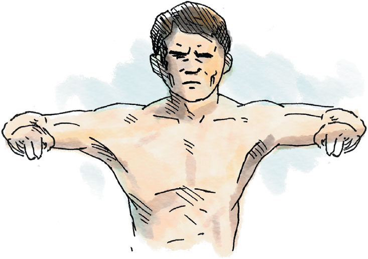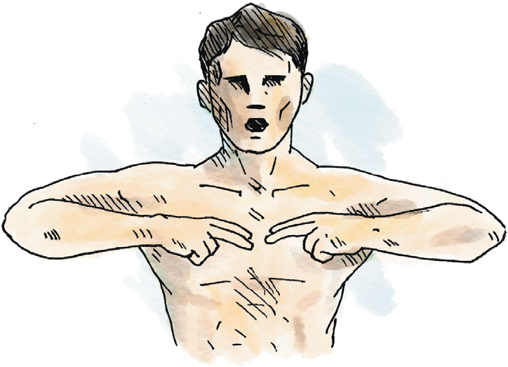 Располагаем руки, согнутые в локтевом суставе, перед грудью (рис. 1). Пальцы сложены, как описано выше. Вытянутые пальцы каждой руки направлены друг к другу. Если опасаетесь, что ударите своего соседа, просто встаньте через одного, упражнение можно выполнять и стоя! Задача очень сложная – на вдохе нужно располагать руки с вытянутыми пальцами друг к другу, а на выдохе – отводить от себя. Вытянутые пальцы при этом будут выставлены вперед (рис. 2). Плечо зафиксировано, движение происходит только в локтевом суставе! По опыту знаю, сколько ни показывай, непременно половина студентов сделают неправильно, поэтому я рассчитываю на ваш интеллект!