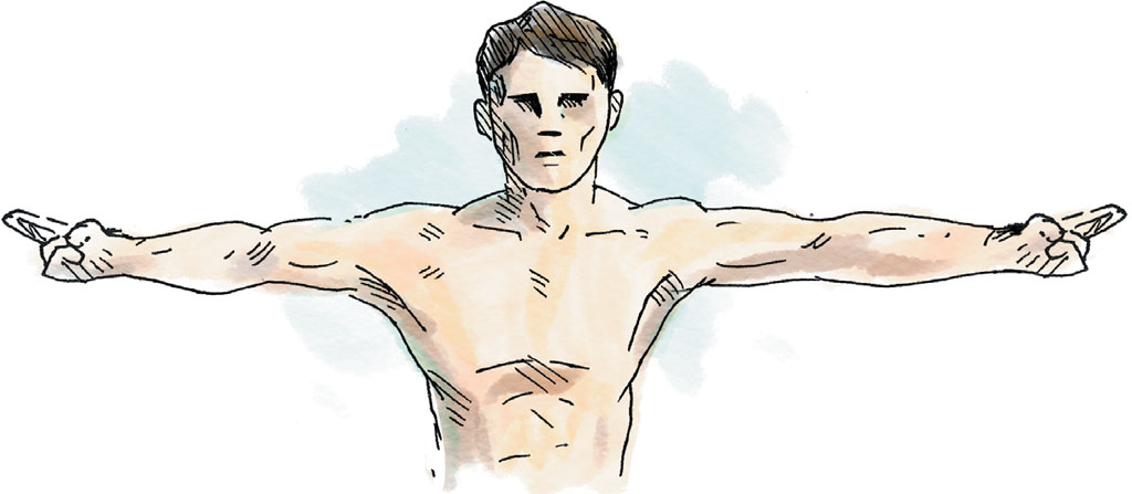 Теперь те, кто стоит, должны сделать небольшой поворот по часовой стрелке на тридцать градусов, – деловито продолжал Наставник. – Почему? Потому что нужно поменять положение пальцев, теперь большой палец накрывает безымянный и мизинец, а не находится под ними, как это было в предыдущих упражнениях. Расставили руки в стороны, так чтобы ладони смотрели в потолок и подлокотные ямки тоже, словно вас растянули за пальчики в стороны… (рис. 4). И в таком положении стоим три минуты! А я расскажу вам, зачем мы это делаем, ибо ничто так не успокаивает, как знание «зачем», – усмехнулся он.