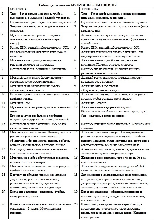 Например, женщина более духовна, чем мужчина. Так создала природа. Она более спокойна, более терпелива, умиротворенна, она способна ждать. Благодаря этим качества она может вынашивать ребенка 9 месяцев. Вполне возможно, что благодаря именно этим качествам у женщины выше сопротивляемость к болезням, и поэтому она дольше живет. Своей безмятежностью и утонченностью женщина прекрасно дополняет мужчину. Она может окружить его атмосферой уюта и спокойствия, которые так необходимы бунтарскому характеру мужчины.