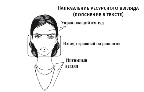 Алан Пиз, известный исследователь невербального поведения из Австралии, считает, что ваш управляющий, командный, приказной взгляд (взгляд начальника на подчинённого, например) должен быть направлен на лоб собеседника, выше линии бровей. Если вы смотрите на лицо собеседника ниже линии его бровей, то это взгляд равного на равного, обычный обмен взглядами при социальных контактах; а если смотрите на грудь, то ваш взгляд приобретает интимные характеристики (см. рисунок).