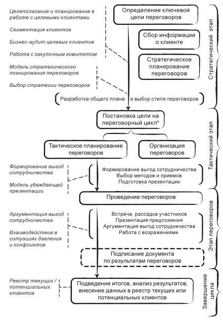 В схеме отражены четыре базовых этапа процесса: стратегический, тактический, собственно этап переговоров и завершение цикла, который в многоэтапных переговорах возвращает нас на этап 1.