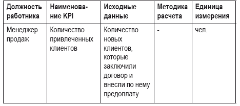 1. Измеримость, которая включает в себя необходимые для расчета исходные данные, методику расчета, если показатель предполагает учет нескольких переменных и имеет обобщающий характер, установление единицы измерения (%, руб., дни, баллы и т. д.). Матрица KPI может иметь следующий вид (таблица 2).