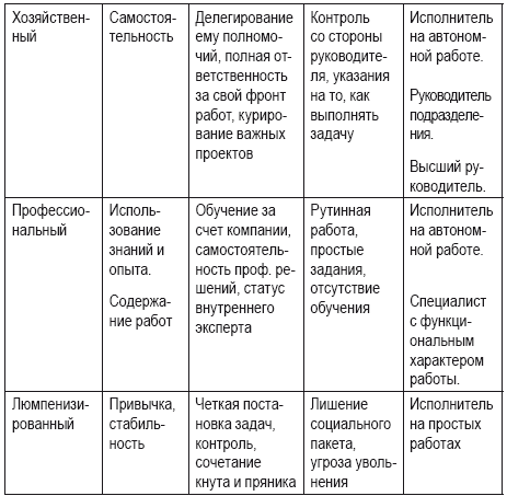 Наша практика показывает, что авторскую типологию можно дополнить еще одним типом, который соотносится с особенностями поколения Y – поколения, которое сегодня активно выходит на рынок труда. Это геймеры, т. е. работники, для которых ключевой профессиональной мотивацией является получение положительных эмоций от процесса. В компании их невозможно удержать ни высокой зарплатой, ни хорошими отношениями в коллективе, ни возможностью развития. Базовые установки действуют в плоскости «хочу – не хочу». Самый распространенный ответ на требование «надо»: «Кому надо? Мне не надо!» Основная мотивация этой категории связана с вовлеченностью в работу, потеря у него интереса к деятельности равносильна потере этого сотрудника.