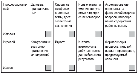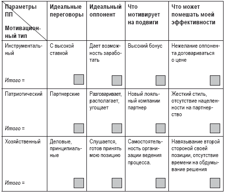 Инструкция: представьте идеальный для вас пример переговорного процесса и попробуйте оценить его по параметрам таблицы 4. На каждый параметр переговорного процесса выделено 5 баллов, которые вы можете присвоить одному мотивационному типу, а можете раскидать их по разным типам в самых разных пропорциях. Например, присвоить все пять баллов только переговорам с высокой ставкой, а всем остальным проставить ноль баллов. Или 2 балла выделить для партнерских переговоров, 2 балла – конкурентным и ноль баллов на все остальные позиции. Оценки можно фиксировать в бланке. Далее считаем баллы по каждой строке и делаем вывод, к какому типу мотивации переговорщика вы более склонны. Самое главное, зная свой тип, вы видите и те позиции, которые являются «слабым местом». Т. е., попадая в некомфортные условия, не соответствующие типу мотивации, вы можете показывать низкий результат. С этим может быть связана некоторая нестабильность результатов переговоров отдельных лиц – особенности конкретных переговорных ситуаций не всегда соответствуют ведущей мотивации работников.