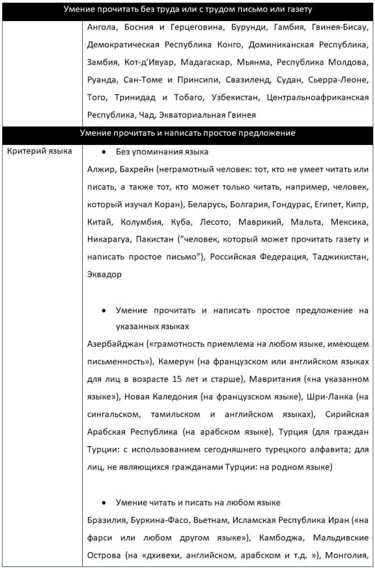 Нижеследующая таблица, основывающаяся на данных, составленных Статистическим институтом ЮНЕСКО, показывает национальные определения грамотности, полученные при помощи различных оценочных средств, включая обследования семей и переписи населения, проведенные в 105 различных странах с 1993 года по 2004 год. Около 80 % перечисленных стран определяют грамотность как способность прочитать и/или написать простое предложение на национальном или родном языке.
