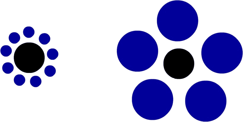 Только убрав окружающий контекст, мы можем понять, что центральные круги в действительности равны. Но, даже зная, что центральные круги одинакового диаметра, нам всё равно кажется, что они изменяют свой размер в зависимости от того, какого диаметра круги их окружают.