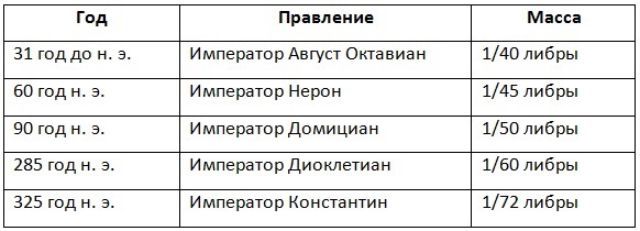 Чтобы представлять себе масштаб сознательной финансовой политики римских правителей по порче монет, достаточно взглянуть на котировки ауреуса за период его хождения с начала нашей эры.