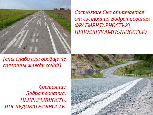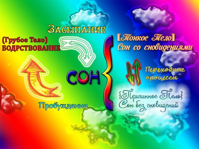 Состояние сна со сновидениями соотносится с состоянием тонкого тела. Подобно тому, как наши мысли в течение дня могут хаотично меняться, и мы от одной мысли к другой, от одного представления о себе к другому можем скатываться. Также и наше состояние сна со сновидениями.