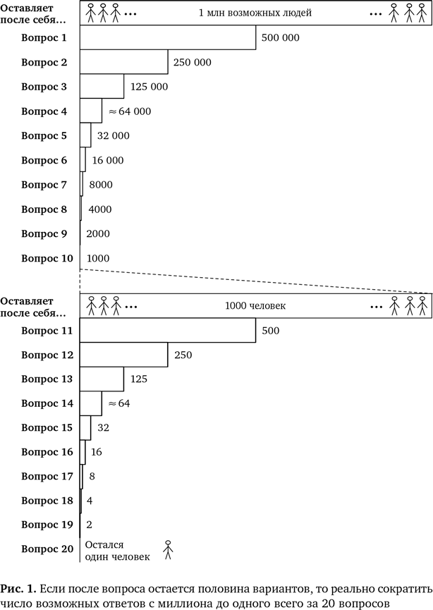 Задавать вопросы, которые оставляют половину возможных ответов, — лучше, чем называть конкретное имя, но насколько? Давайте предположим, что я изначально задумал кого-то одного из миллиона. Если после каждого вопроса отметать половину людей, сколько вопросов понадобится? После первого останется 500 000 человек, после второго — 250 000... После десяти вопросов от исходного миллиона останется примерно 1000 человек (рис. 1). Продолжаем... После следующего вопроса осталось 500, потом 250, 125... и на двадцатом вопросе остается один возможный человек. Если вам удастся каждый раз точно задавать вопрос, после которого останется половина ответов, то вы гарантированно выиграете. И всегда это будет 20 вопросов.