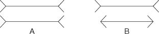 Смена направления ломает существующие шаблоны, вызывая появление новых. Вы смотрите на предмет, а потом выворачиваете его наизнанку, вверх ногами, задом наперед. На рисунке фигура А состоит из двух линий равной длины, ограниченных стреловидными углами. На рисунке В стреловидные углы на одной из линий обращены в другую сторону, что меняет наше восприятие: кажется, что эта линия короче. Но это не так. Измерив ее, вы обнаружите, что она по-прежнему той же длины, что и остальные. Сами линии не изменились – поменялось их восприятие вами.