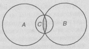 На санскрите «душа» называется атманом, дживой. Атма буквально означает «я», «маленькая частичка». От этого слова произошло слово атом. Джива означает «живой». И вот мы очень маленького размера по своей природе имеем дело с большой вселенной, ее законами и правилами. При взаимодействии с ней у нас появляется бесконечное множество разных желаний. Видя то или иное многообразие мира, мы, крошечные (атма) живые существа (джива), хотим подучить все или часть этого многообразия в свое распоряжение. Иными словами, сделать любой объект своим. Но тут происходит конфликт. Живых существ ведь очень много, и каждое из них желает что-то взять от этого мира и присвоить себе. Это значит, что их желания рано или поздно соприкоснутся друг с другом. Эти два желания двух разных людей, направленные на один и тот же объект, приведут к проблеме, потому что каждый из них хочет этим объектом обладать. Это легко понять на примере с кругами Эйлера. Предположим, есть два субъекта А и В и некий объект С. Когда оба эти субъекта захотят владеть С, то происходит конфликт (рис. 1).