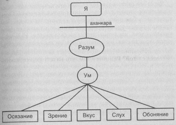 Рассмотрим пример, который приводится в Катха-упанишаде (1.3.3-4), — он явно иллюстрирует, как функционируют чувства, ум, разум и душа. Представим себе колесницу. Она запряжена пятью лошадьми — это наши познающие органы чувств: слух, вкус, обоняние, осязание, зрение. Ум — это вожжи, а разум — это возничий, держащий вожжи в руках и управляющий пятью этими лошадьми. В колеснице позади разума сидит на сиденье душа, которая является пассажиром этой повозки. Так образно выглядит колесница нашего тела. В Ведах говорится, что эти пять лошадей, органов чувств чрезвычайно сильны. Они несут нас в разные стороны, бросая колесницу то вправо, то влево. Они то разгоняют ее, то резко останавливают. Поэтому, если разум (возничий) слабый, эти лошади берут контроль над повозкой и тогда, став неуправляемыми, несут ее и пассажира (душу) прямо в пропасть. Если ум слабо держится в руках у разума, то это приводит к гибели, потому что никто больше не в силах остановить этих неугомонных лошадей. Однако если разум силен, то он крепко держит вожжи ума, и потому лошади находятся в полном повиновении и тогда ведут колесницу тела по верному пути. Тогда душа, сидящая на колеснице, спокойно поедет по жизни, испытывая от этой дороги счастье.