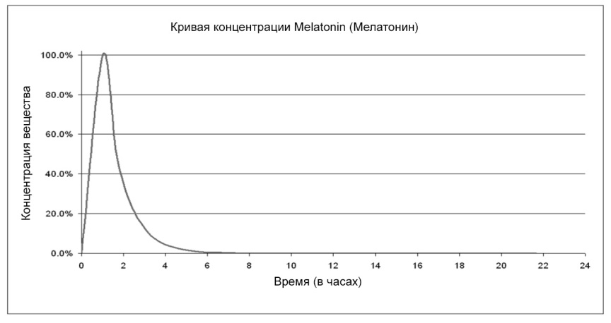 Кривая концентрации: Мелатонин быстро абсорбируется и обладает коротким периодом полувыведения. Пиковые значения в плазме крови достигаются через 60 минут после приема и он практически полностью выводится из организма через 6 часов (примерно 4 цикла сна).