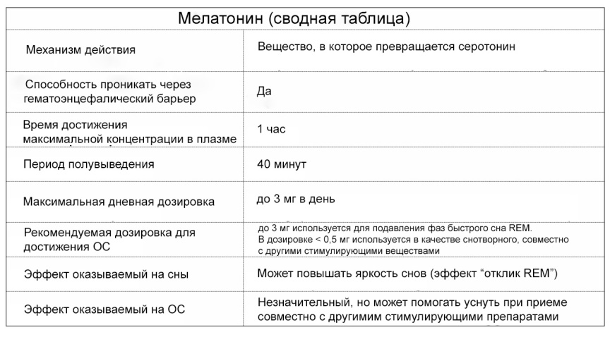 Влияние на ОС: я использую Мелатонин в качестве дополнительного препарата. Когда я принимаю комбинацию веществ, которые по моему опыту могут вызвать бессонницу, я иногда принимаю 0,3 мг Мелатонина что бы быстрее уснуть. При такой маленькой дозировке фазы быстрого сна не подавляются, а шансы выйти в ОС значительно повышаются.