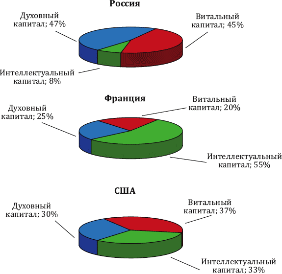 Как видно, Интеллектуальный капитал в России составляет незначительную величину – всего 8 %. По сравнению с другими странами, например, США и Францией – это примерно в 4–7 раз меньше.
