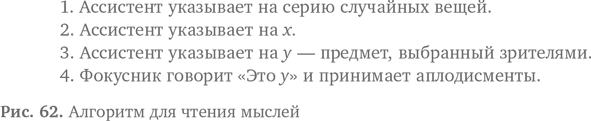 Если вас попросят снова показать фокус и попытаться угадать серию предметов, закономерность станет слишком очевидной. С этим легко справиться, применив немного алгоритмического мышления и расширив алгоритм. Каждый раз, выполняя фокус, вы используете разные предметы, прежде чем указать на выбранный, — например, лампу, потом ковер, потом выключатель. Теперь x меняется каждый раз. Код для совместного использования может выглядеть примерно как на рис. 63.