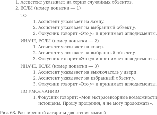 Конечно же, перед началом вам надо убедиться, что у вас есть лампа, ковер и выключатель. Вы указываете на лампу, пытаясь угадать первый предмет (когда номер попытки — 1), ковер при угадывании второго предмета (когда номер попытки — 2) и выключатель для третьего раза (когда номер попытки — 3). Последнее утверждение по умолчанию — на случай, если вас попросят найти четвертый, пятый или даже шестой предмет. Некоторых людей невозможно удовлетворить! К этому вы не готовы, но правильное алгоритмическое мышление должно обеспечить варианты на любой случай. Поэтому у вас есть отговорка по умолчанию, если кто-то из зрителей будет настаивать на продолжении после трех заготовленных чудес ясновидения: «Мои экстрасенсорные возможности истощены. Прошу прощения, я не могу продолжать».