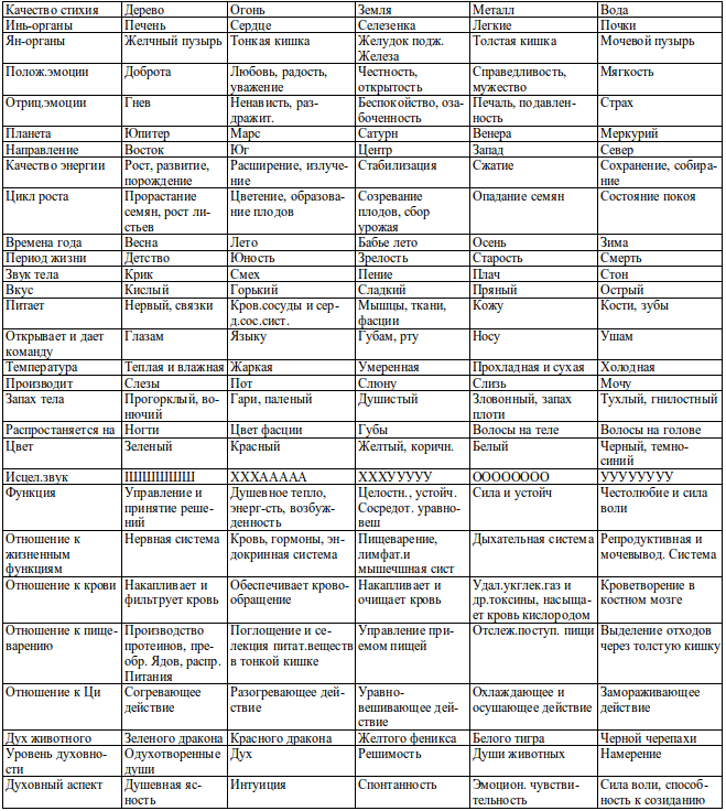 Таблица отношений Пяти Фаз Энергии (рис. 1-26) представляет качества и взаимосвязь ДЕРЕВА, ОГНЯ, ЗЕМЛИ, МЕТАЛЛА И ВОДЫ. Изучите эту таблицу и обращайтесь к ней почаще, чтобы научиться понимать разницу между этими фазами.