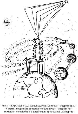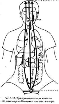 Три пронизывающих капала образуют центральный энергетический пуп,. Энергия Универсума и Энергия Земли текут по ним вверх или вниз через область пупка (рис. 1-17). По сравнению с Микрокосмической Орбитой, эти каналы проходят глубже внутри тела.