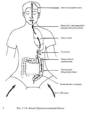 Левый Пронизывающий Канал начинается в левом яичке (у мужчин), проходит с левой стороны промежности, ануса, яичников (у женщин, по левой почке, через селезенку, сердце, левое легкое, левую пара щитовидную железу, щитовидную железу, левое ухо и глаз и левое полушарие мозга (рис. 1-14).