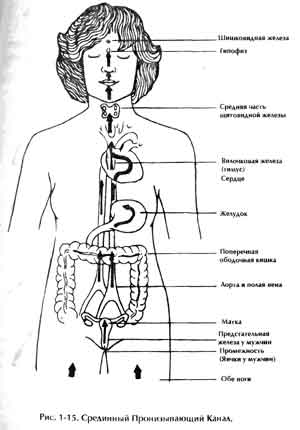 Срединный Пронизывающий Канал начинается в середине мошонки (у мужчин), проходит через промежность, середшгу ануса, шейку матки (у женщин), предстательную железу (у мужчин), аорту, полую вену, поджелудочную железу, желудок, задевает часть, печени, через сердце, вилочковую железу (тимус), горло, язык, гипофиз, гипоталамус и шишковидную железу, а затем идет к макушке головы (рис. 1-15).
