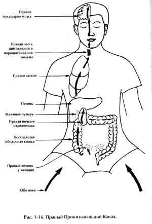 Правый Пронизывающий Капал начинается в правом яггчке (у мужчин), проходит с правой стороны промежности, ануса, яичников (у женщин), по правой почке, через селезенку, сердце, правое легкое, правую паращитовидную железу, щитовидную железу, правое ухо и глаз и правое полушарие мозга (рис. 1-16).