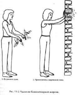 2. Если у вас нет хорошей связи с деревом (или если его нет рядом), вы можете использовать стену и через нее опустить болезненную энергию в землю. Сначала встряхните и расслабьте ваши руки, почувствуйте, как они становятся теплыми. Затем прикоснитесь к бетонной или кирпичной стене, пока не почувствует как болезненная энергия переходит в нее (рис.11-2).