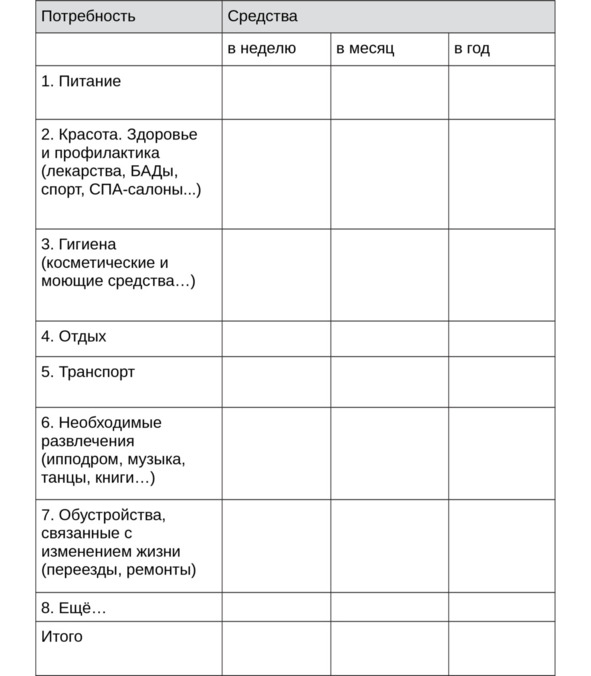 Вернёмся к работе с таблицей 1 (стр. 31). В соответствующие колонки впишем цены. То есть нужно перевести все свои потребности на деньги, сосчитать расходы в неделю, в месяц, в год. Затем сложим и запишем суммы, необходимые в разных областях жизни. Анализировать эту картину будете самостоятельно. Обычно те, кто нервничает из-за нехватки денег, выполнив задание, удивляются их вполне адекватному количеству. Трудно выполнять это занятие после скачков инфляции, если потребности только в еде. Если все области жизни были просчитаны, то в итоге всё уравновешивается: где-то подъём, где-то понижение или стабильность. Переведём потребности в денежный эквивалент, определив, сколько денег нужно для проживания.