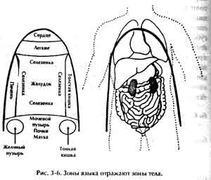Различные зоны языка отражают состояние внутренних органов. Корень языка - это проекционная зона почек. Центральная часть языка отражает состояние желудка и селезенки. Кончик языка указывает на состояние сердца. Зона, расположенная между кончиком и центром отражает состояние легких. Правая сторона языка связана с желчным пузырем. Левая сторона языка отражает состояние печени (рис. 3-6).