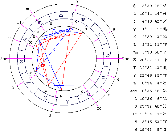 Я заметил, что когда Сатурн является элементом XII дома и имеет напряженные аспекты к элементам IX дома, то это и есть прямое указание на тюрьму, причем человек сидит несколько лет. Если субъект сидит несколько месяцев, то в формуле "отсидки" вы Сатурн не обнаружите. Здесь Сатурн является соуправителем XII дома. Почему? XII дом узкий, Близнецы в нем занимают 10°18'', а Козерог - 10°35''. Вот, кстати, пример, когда необходима высокая точность рассчета карты уже на уровне радикса (а не только прогрессий).