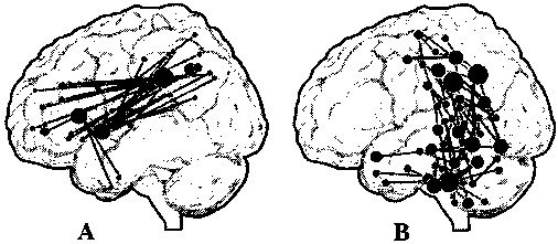 Рис. № 10. Активность нервных центров в «высоко креативном мозге» (А) и «низко креативном мозге» (В)
