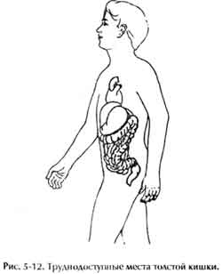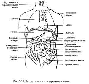 Толстая кишка состоит из следующих отделов: слепой кишки с аппендиксом, ободочной кишки (которая делится па восходящую, поперечную, нисходящую и сигмовидную части), прямой кишки и ануса (рис. 5-11). Вся толстая кишка представляет собой трубку около полутора метров длиной, которая начинается в нижней правой части брюшной полости от плеоцекального клапана (моста соединения толстой и тонкой кишки) и поднимается вверх к печени. Под печенью она поворачивает влево и идет поперек тела к селезенке, где делает следующий изгиб, после чего спускается вниз по левой части брюшной полости. Затем снопа поворачивает в области левой тазовой кости, где переходит в сигмовидную кишку. После этого, изгибаясь в полости таза, она оканчивается прямой кишкой и анусом. Изгибы толстой кишки, особенно с левой стороны, глубоко спрятаны в труднодоступных местах брюшной полости (рис. 5-12).