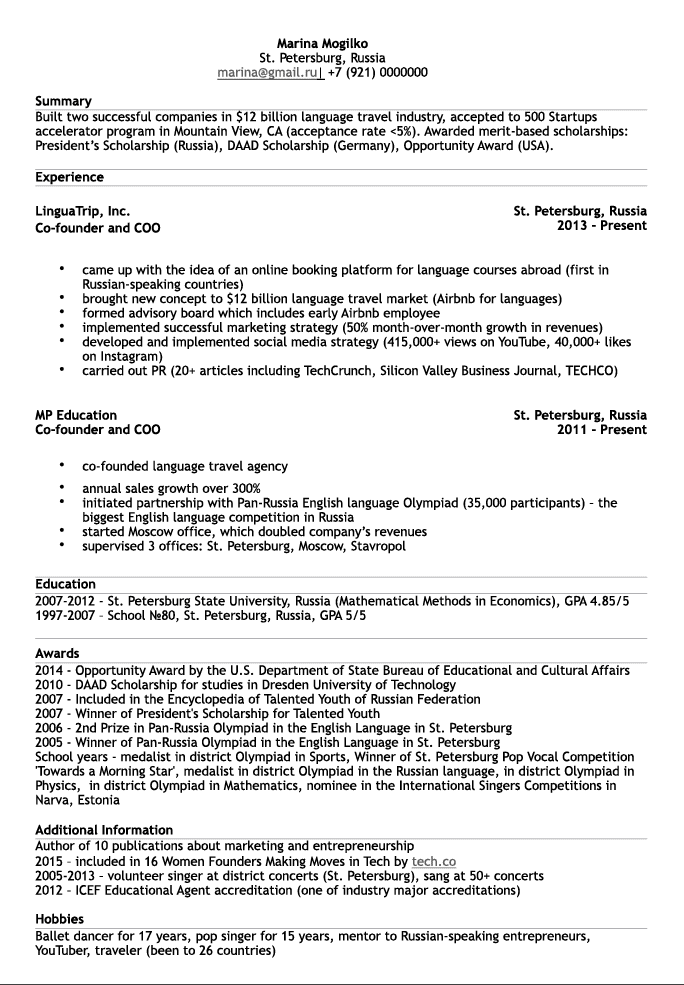 Все вышеперечисленное – стандарты Stanford University. Опираясь на эти рекомендации, я составила резюме в 2015 году. Я отсылала его в Johns Hopkins University, University of Florida, и меня туда приняли, так что все эти правила работают.