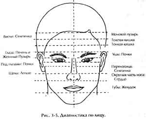 Покраснение лица указывает на существование нарушений в сердечно-сосудистой системе, особенно это относится к покраснению вокруг копчика носа. Темный цвет лица, особенно вокруг глаз, указывает на проблемы с почками. Белое, бледное лицо свидетельствует о нарушении работы легких. Желто-зеленый цвет лица говорит о проблемах, связанных с печенью, желто-оранжевый - о проблемах, связанных с селезенкой.