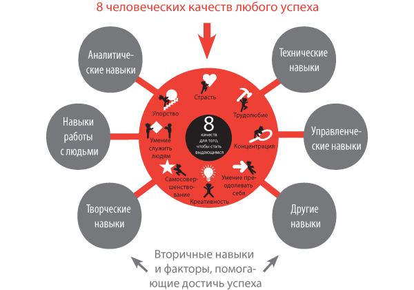 Эти восемь качеств и составляют основу успеха в любой отрасли человеческой деятельности. А что сказать о 300 других, которые тоже помогают в этом деле? Это, например, позитивный настрой, умение определять свои цели или умение рисковать. Их можно определить как вторичные факторы успеха: кому-то они помогают, но без них можно и обойтись.