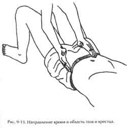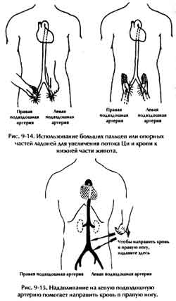 с. Когда область очищена, станьте или сядьте сбоку от ученика (или между его ногами) и нажмите ребрами обеих ладо ней на левую и правую наружные подвздошные или бедренные артерии. Надавливать следует на обе артерии одновременно (рис. 9-13 и 9-14). Это поможет направить кровь обратно в тазовую или паховую область. Повторите два-три раза, каждый раз надавливая в течение 10 секунд. Если вы хотите направить кровь в левую ногу, уменьшите давление левой ладони. Для того чтобы направить кровь в правую ногу, отпустите ладонь правой руки (рис. 9-15).