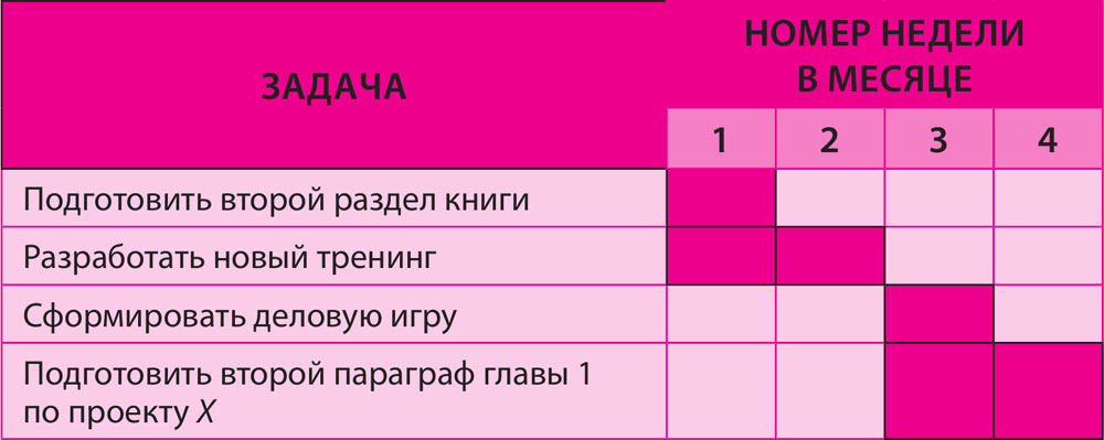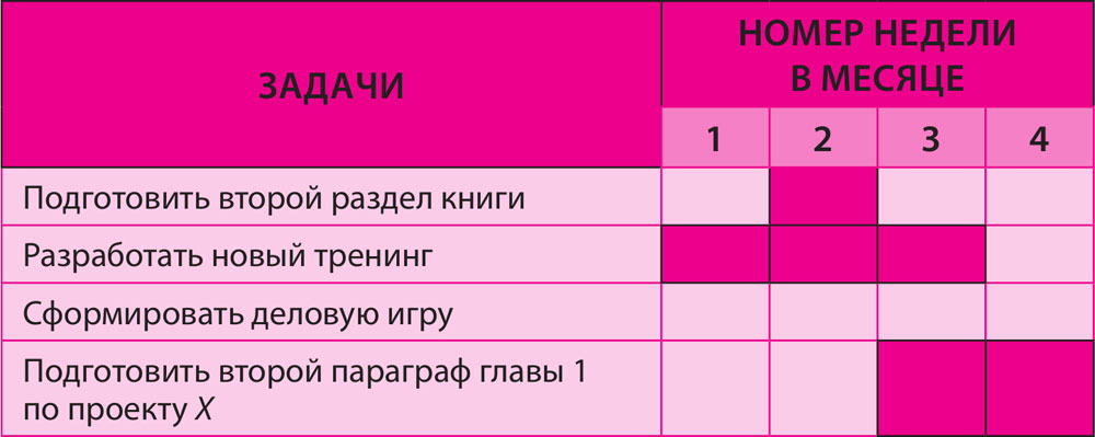 Пример из жизни одной Деловой Колбасы. Деловая Колбаса запланировала четыре важные задачи на месяц. Они четко распределены по неделям.