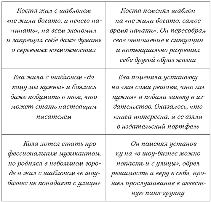 Это типичные установки и штампы. Например, «если ты не родился в семье миллионера, то и нечего думать о том, чтобы разбогатеть». Или «скромность украшает человека». А вот мои любимые: «не жили богато, нечего начинать», «все самое прекрасное происходит в молодости». Есть еще неочевидные: все самое интересное происходит в юности или после тридцати человек начинает болеть (да ну?).