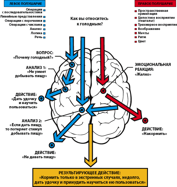 Анализ: «если дать пищу, то потеряет стимул добывать пищу». Действие: «не давать пищу».