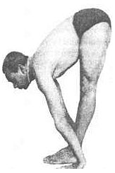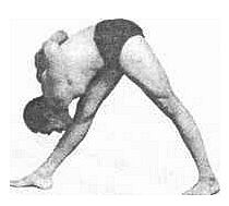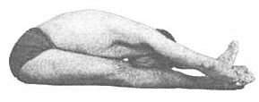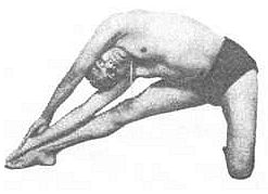 «28. Вытяните обе ноги и захватите руками большие пальцы ног, положите голову на колени. Это будет Пашчимоттанасана.