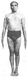 Затем, как уже было показано в главе «Асаны», «позу свечи», как и «позу плуга», следует выполнять исключительно с подкладкой под шею и руки, когда создана опорная плоскость, которая выше поверхности пола на 5-15 сантиметров. Величина перепада высоты диктуется гибкостью и длиной шеи. Высота площадки должна быть такой, чтобы позвоночник был при выдержке «Сарвангасаны» прямым, грудная клетка не стиснута, а раскрыта, чтобы дыхание осуществлялось по естественному рисунку — как животом, так и грудной клеткой. Как мы видим на рис. 6, тело у Айенгара вертикально полу, а на рис. 56 грудная клетка стиснута, что обусловлено подниманием рук вверх. У подавляющего большинства начинающих в положении на рис. 6 грудная клетка будет даже хуже, чем на рис. 8.