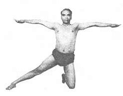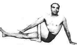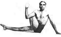Сесть на пол, ноги вперед. Одну из ног согнуть в положение «Вирасаны», вторая вытянута, прямая в колене. Затем с выдохом медленно, используя принципы исполнения «Пашчимоттанасаны», уходить вперед туловищем, складываясь в поясе пополам, серединой живота и грудной клетки на прямую ногу. Цель — лечь телом на ноги. Неважно, что одна из них прямая, а другая согнута в колене, лечь без какого-либо перекоса туловища по отношению к плоскости пола. Положение рук уже вторично: можно сцепить их за ступней прямой ноги или просто положить на пол. Колени согнутой и прямой ног держатся вместе, не разъезжаются. Если вы свободно делаете «Вирасану» и «Пашчимоттанасану», то эта поза получится у вас с легкостью, если нет — трудности обеих поз будут проявлены одновременно. Если — когда вы сгибаетесь вперед — туловище перекашивает (при некачественном сгибании колена), следует упираться противоположной от согнутой ноги рукой в пол, чтобы фиксировать тело с минимумом трудности. Эффект: комбинированное воздействие на связки, суставы и позвоночник.