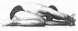 Итак, разобравшись с ощущениями, вернемся к выполнению «Сарвангасаны». Лечь на пол спиной, создав импровизированную площадку из одеял или чего-нибудь другого. С таким расчетом, чтобы при «вставании» на плечи задняя сторона шеи оказалась на грани перепада от более высокой плоскости к полу (голова затылком лежит на полу). Низ шеи и руки, подпирающие поясницу, должны располагаться на этом искусственном возвышении. Повторяю, что, подобрав соответствующую состоянию вашей шеи высоту перепада, вы сможете выпрямить туловище (включая грудной отдел позвоночника) в вертикаль, чем обеспечатся требование прямизны спины и свободное, естественное недеформированное формой позы дыхание.