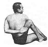 Сесть, вытянуть левую ногу вперед по полу, правую согнуть в колене так, чтобы икра и поверхность бедра были плотно соединены, то есть нога сложена вдвое. Пятка касается ягодицы. Затем надо развернуться вправо и занести левую руку за согнутую и стоящую правую ногу. Причем она стоит у прямой ноги, а не за ногой, то есть пятка правая касается правой же ягодицы. Прямая в локте рука — левая — отжимает влево согнутую правую ногу, и ее кисть зацепляется за прямую левую ногу с наружной стороны ниже ее колена. При этом согнутая вверх нога стоит более или менее вертикально, не заваливаясь слишком влево, иначе теряется смысл и форма скручивания.
